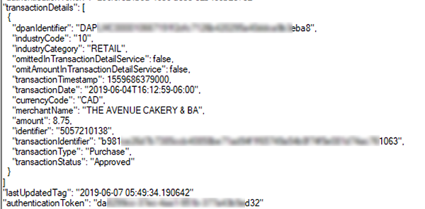 Note that "transactionTimestamp" is in UNIX time.