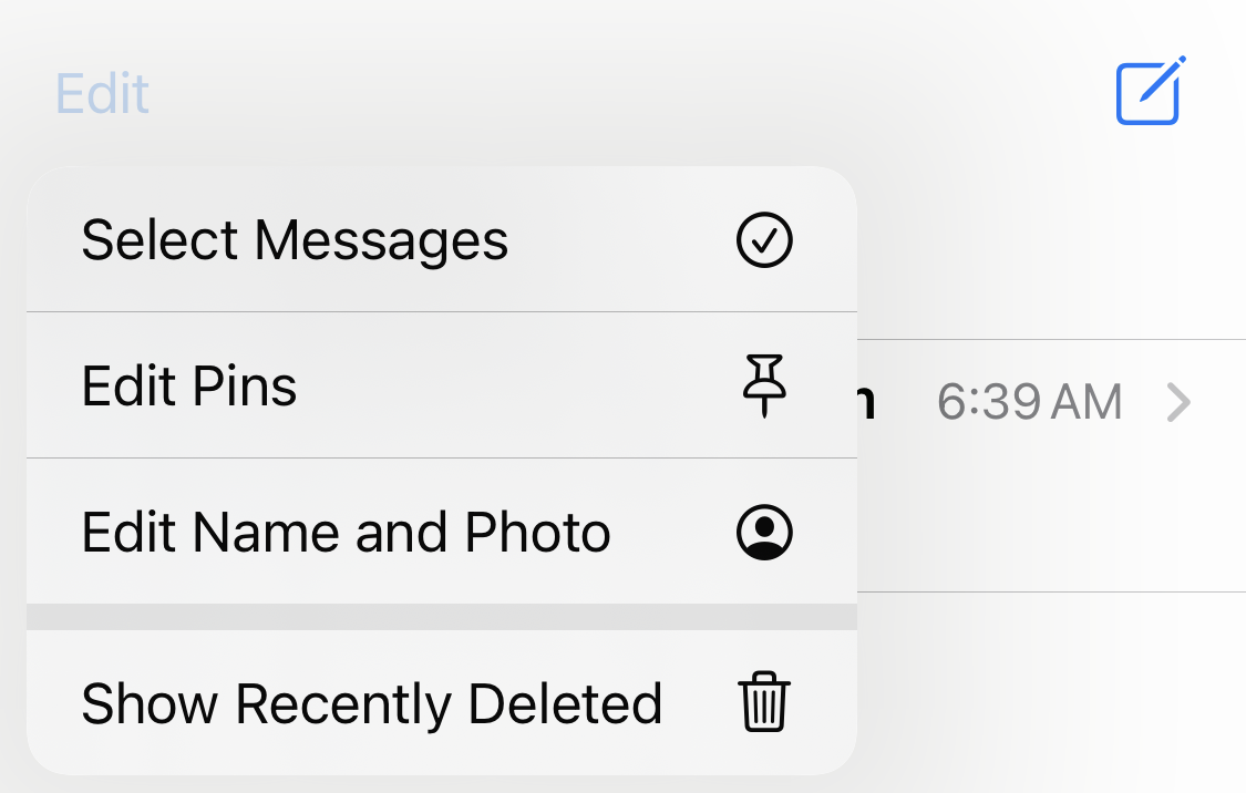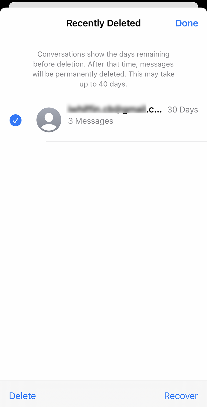 Finally, I deleted (rather than unsent) a message. Interestingly, it now placed the deleted message into a Recently Deleted folder, much like when you delete photos. These deleted messages can be totally deleted or recovered.