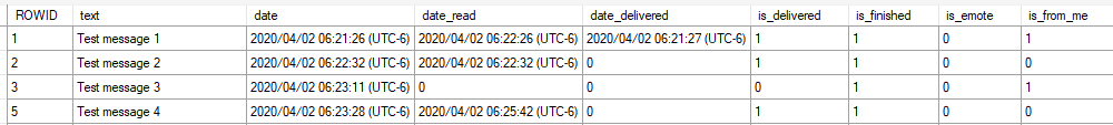 The first clue in this case (and this won't always be present) is that "Test Message 3" failed to send. (You can see that because column "is_delivered" is 0).